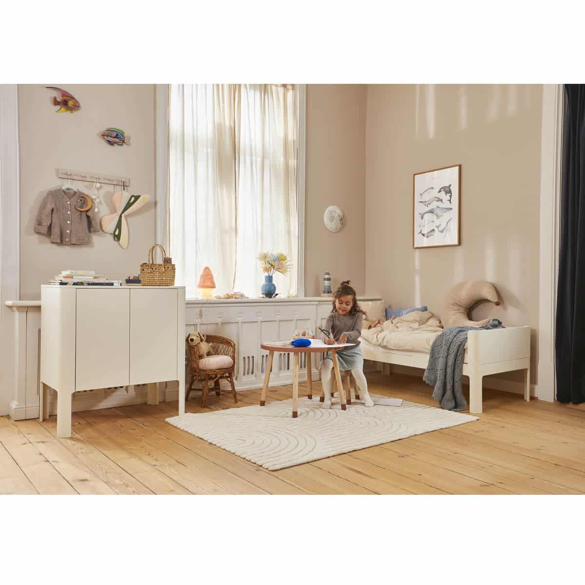 Yhdestä pehmeälinjainen hoitopöytä muiden FLEXA Nova -malliston mukautuvien lasten huonekalujen kanssa – kaikki on valmistettu FSC™-sertifioidusta puusta ja ne ovat palkitun tanskalaisen suunnittelijan Charlotte Høncken suunnittelemia. ”