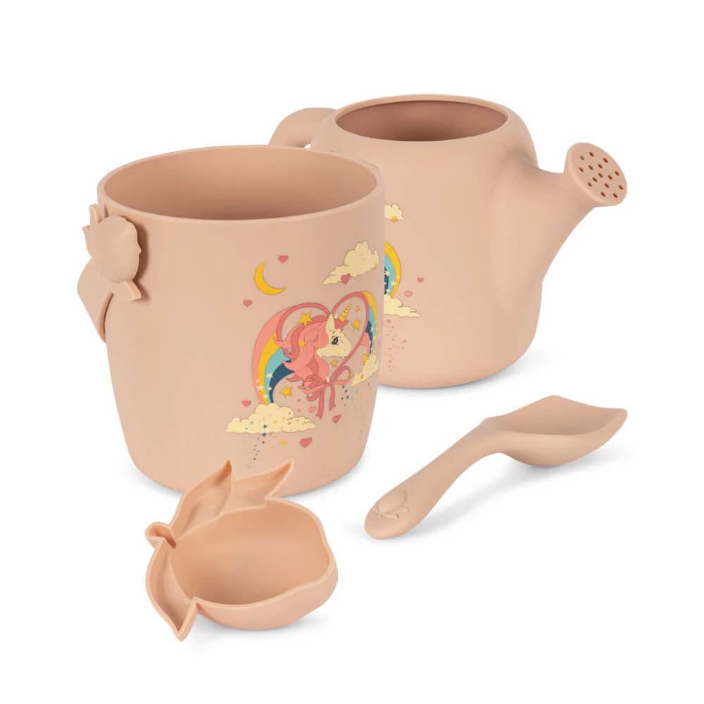 Kauniit hiekkalelut/rantalelut lapselle hauskoilla printeillä. Lelusetissä tulee mukana kastelukannu, ämpäri, lapio ja sitruunanmuotoinen hiekkamuotti. Silikoniset lelut toimivat loistavasti myös kylpyleluina kylpyammeessa tai kahluualtaassa. Materiaali on miellyttävä ja pehmeä lapsen pienille käsille.