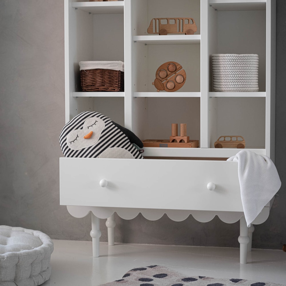 BESTSELLER! Babushka-malliston kirjahylly hurmaa kauniilla muotoilullaan. Tämä viehättävä ja toiminnallinen huonekalu on täydellinen lisä mihin tahansa lastenhuoneeseen, yhdistäen estetiikan ja käytännöllisyyden. Vankan rakenteensa ja harkitun muotoilunsa ansiosta hylly ei ainoastaan näytä kauniilta, vaan tarjoaa myös turvallisen ja kätevän säilytysratkaisun lapsen leluille, kirjoille ja muille aarteille. Tämä on ihanteellinen ratkaisu vanhemmille, jotka arvostavat korkeaa laatua ja ainutlaatuista tyyliä. Kirjahyllyn alaosassa oleva laatikko on varustettu korkealaatuisilla itsestään sulkeutuvilla kiskoilla.