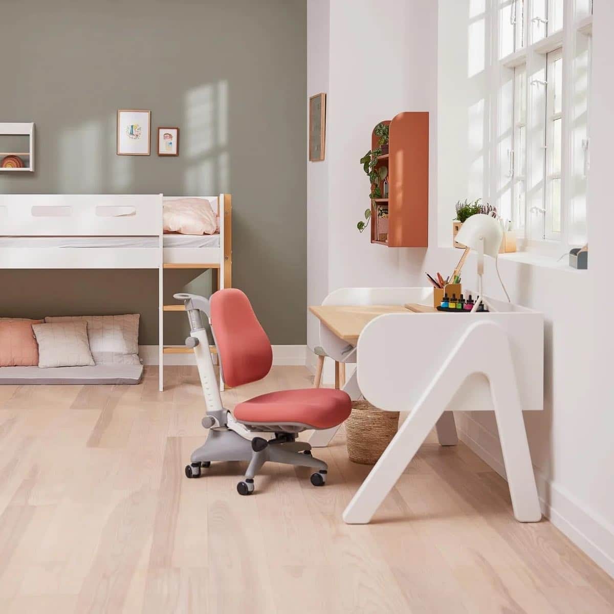 Aika läksyille! Verto on täydellinen lasten työtuoli ja koulutuoli 5-vuotiaasta alkaen. Tuolissa on säädettävä istuinkorkeus ja -syvyys, korkeussäädettävä ja kallistettava selkänoja, joten sitä voidaan säätää lapsen mieltymysten mukaan oikean istuma-asennon saavuttamiseksi ja hyvän ergonomian ylläpitämiseksi. Lukittavat pyörät sopivat useimmille lattioille. Tuoli on saatavana kolmessa värissä. Värit vastaavat Flexa Study-työpöytien värejä.
