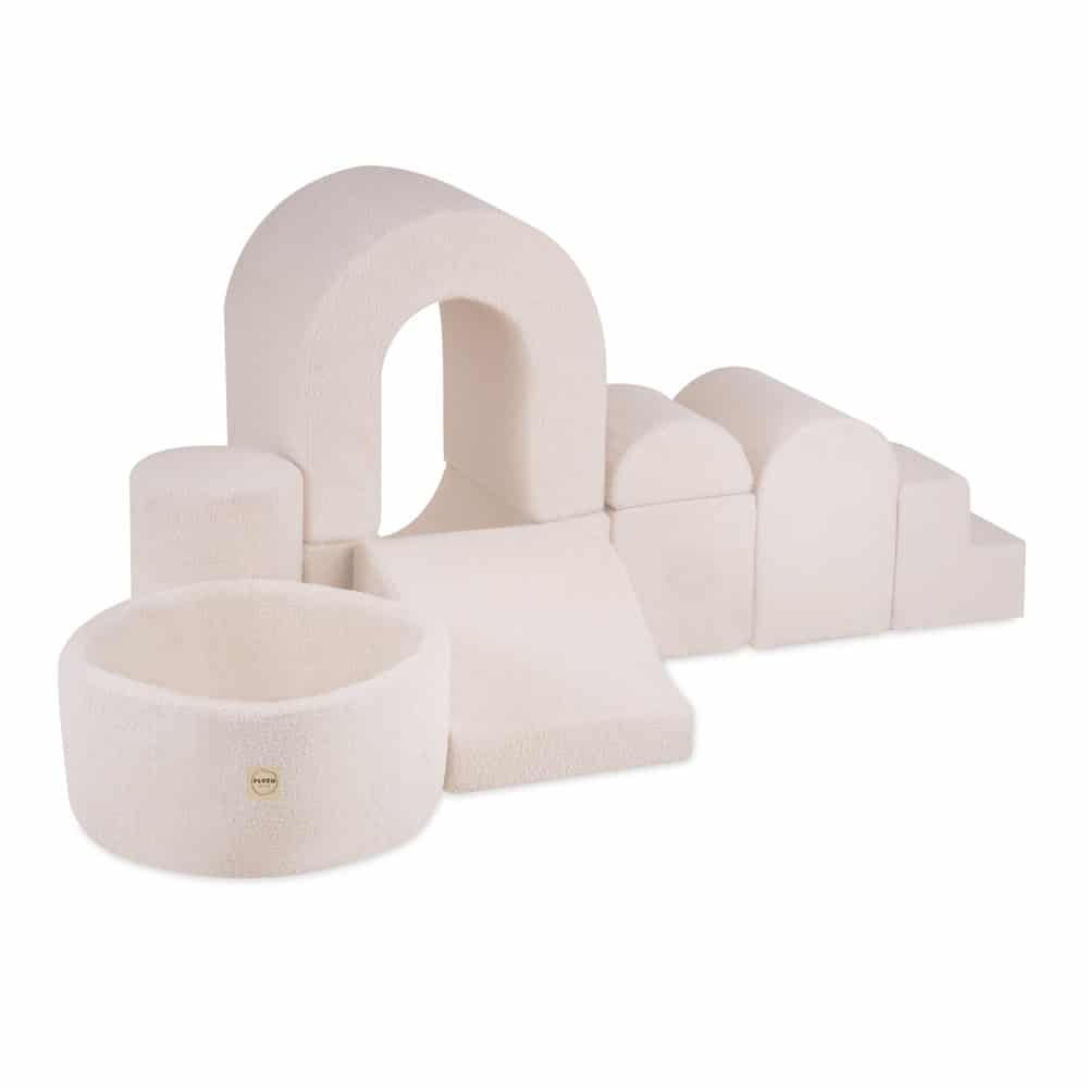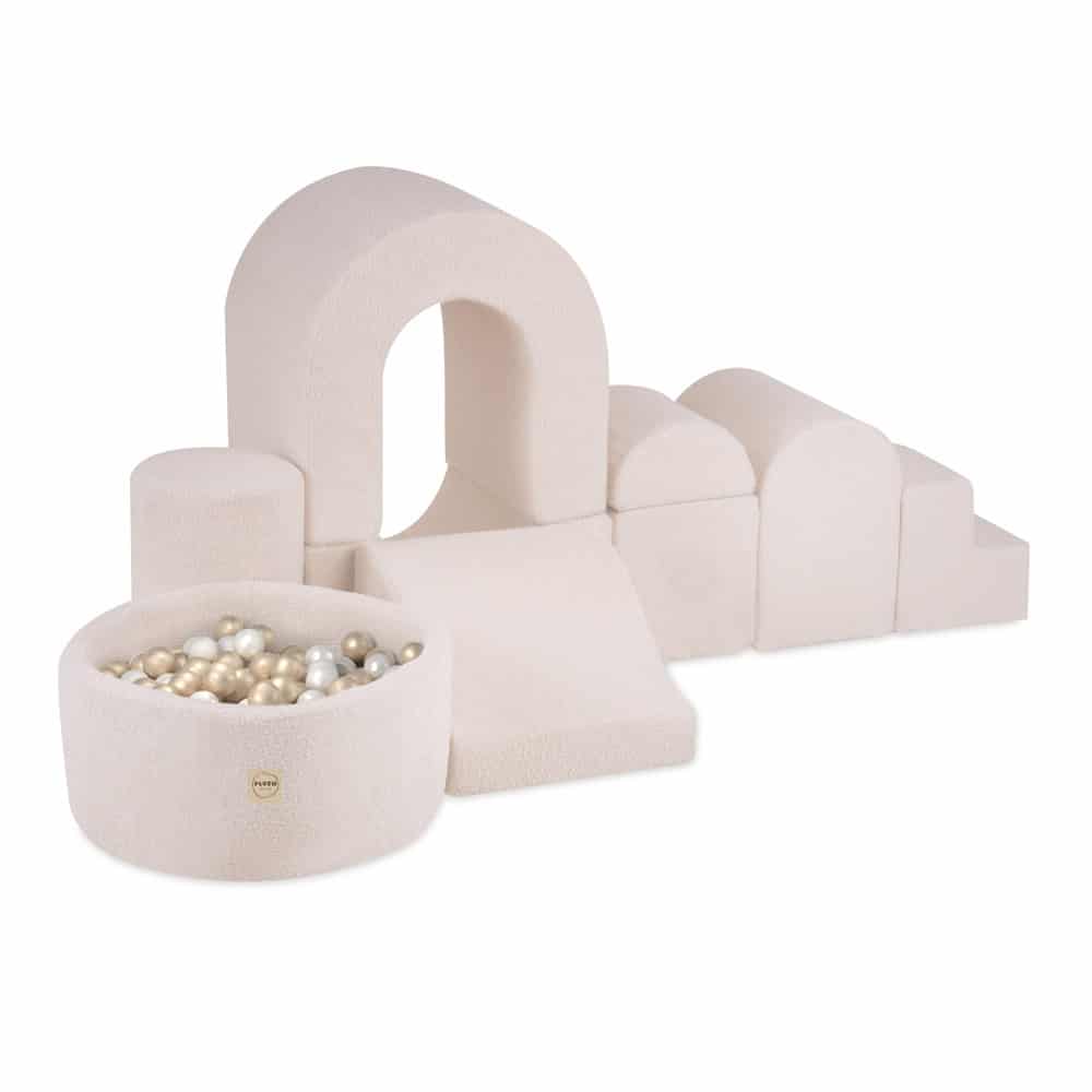 Upea leikkilinna koostuu kahdeksasta leikkimoduuliosasta, sekä pallomerestä! Tämän kokonaisuuden avulla jokainen leikkihetki muuttuu lapsellesi unelmien matkaksi! Kokonaisuus on täydellinen yhdistelmä toiminnallisuutta ja estetiikkaa. Leikkimoduulin osien päällisetr on valmistettu korkealaatuisesta vakosametista, joka on sekä kestävä että poikkeuksellisen pehmeä koskettaa. Voit siis olla varma, että lapsesi leikkii turvallisesti ja nauttii jokaisesta pehmeästä hetkestä.