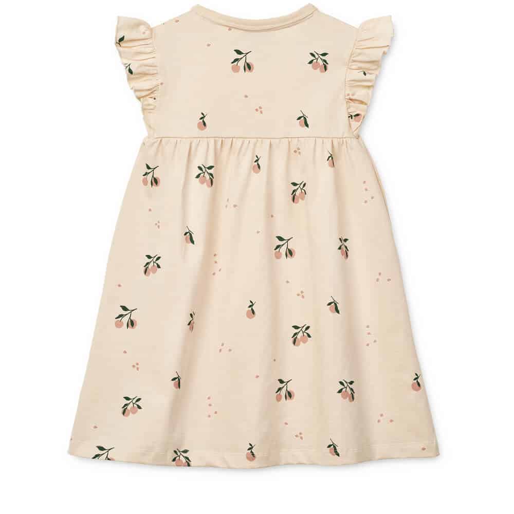 Hurmaava Liewoodin lasten mekko kauniilla persikkaprintillä ja röyhelöhihoilla. Mekossa yhdistyy täydellisesti mukavuus ja tyyli lämpimiin nopeisiin arjen asuihin ja kesäisiin retkiin perheen kanssa.