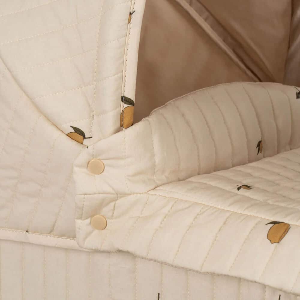 Vintage-tyyliset Konges Sloej- nukenvaunut pienemmässä versiossa, jota pienten nukkevanhempien on helppo ohjata. Neljällä isolla pyörällä, jotka tekevät kävelystä helppoa ja vakaata, tikatulla kankaalla ja hienoilla kampasimpukanmuotoisilla reunoilla. Nukenvaunuihin kuuluu kokoontaitettava aurinkokatos ja pehmustettu säilytyskori nostolaitteen alla. Runko on valmistettu metallista ja siinä on pehmeät kahvat.