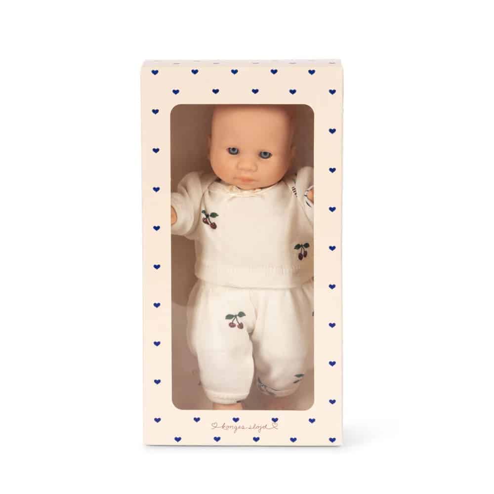 Pehmeä pieni nukke on keskivartalossa kankainen ja se on puettu kauniiseen kaksiosaiseen puuvilla-asuun missä on söpöt kirsikkakuviot. Nukke toimitetaan suloisessa pienessä lahjarasiassa.