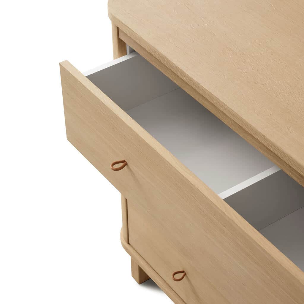 Näkymättömät ruuvit antavat lipastolle puhtaan ja eksklusiivisen muotoilun ja ovat Oliver Furnituren tunnusomainen tavaramerkki. Tyyli on moderni, ja siinä on puhtaat linjat, pyöreät muodot ja hienostuneet yksityiskohdat, kuten täysjyvänahasta valmistetut vetimet ja integroidut, pyöreät koukut. Ainutlaatuinen pehmeä sulkeutumistoiminto vaimentaa laatikoiden sulkeutumista, jotta pienet sormet eivät jää puristuksiin.