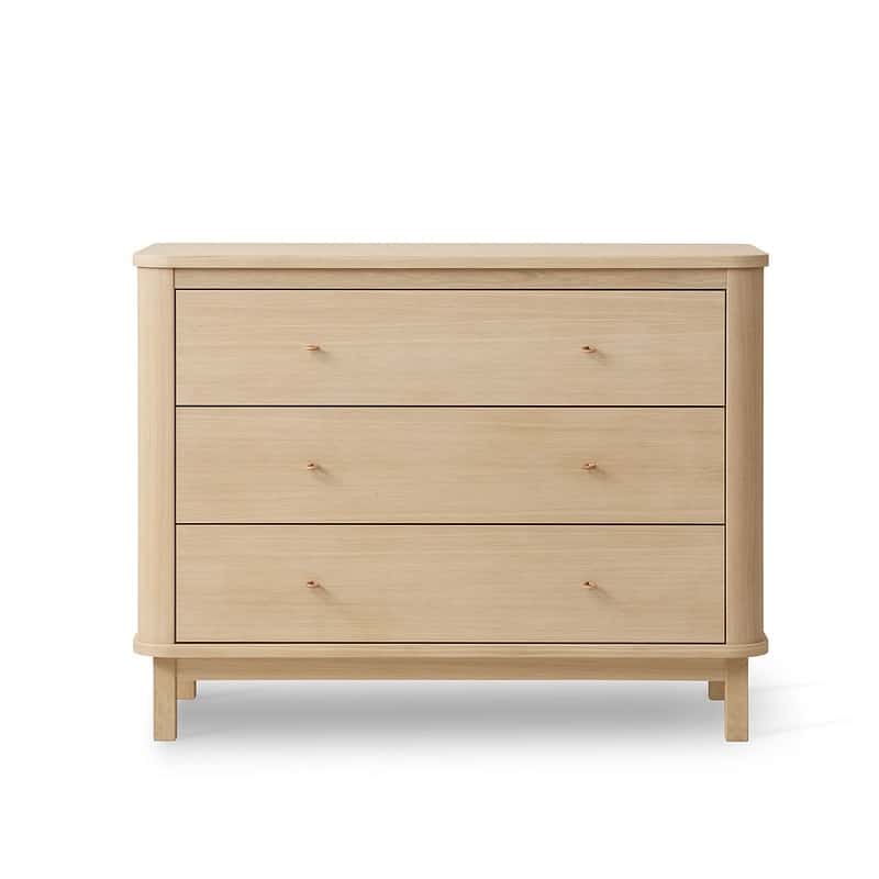 Näkymättömät ruuvit antavat lipastolle puhtaan ja eksklusiivisen muotoilun ja ovat Oliver Furnituren tunnusomainen tavaramerkki. Tyyli on moderni, ja siinä on puhtaat linjat, pyöreät muodot ja hienostuneet yksityiskohdat, kuten täysjyvänahasta valmistetut vetimet ja integroidut, pyöreät koukut. Ainutlaatuinen pehmeä sulkeutumistoiminto vaimentaa laatikoiden sulkeutumista, jotta pienet sormet eivät jää puristuksiin.