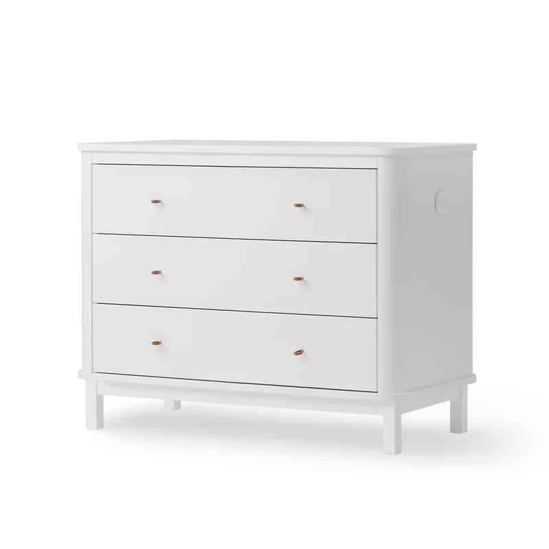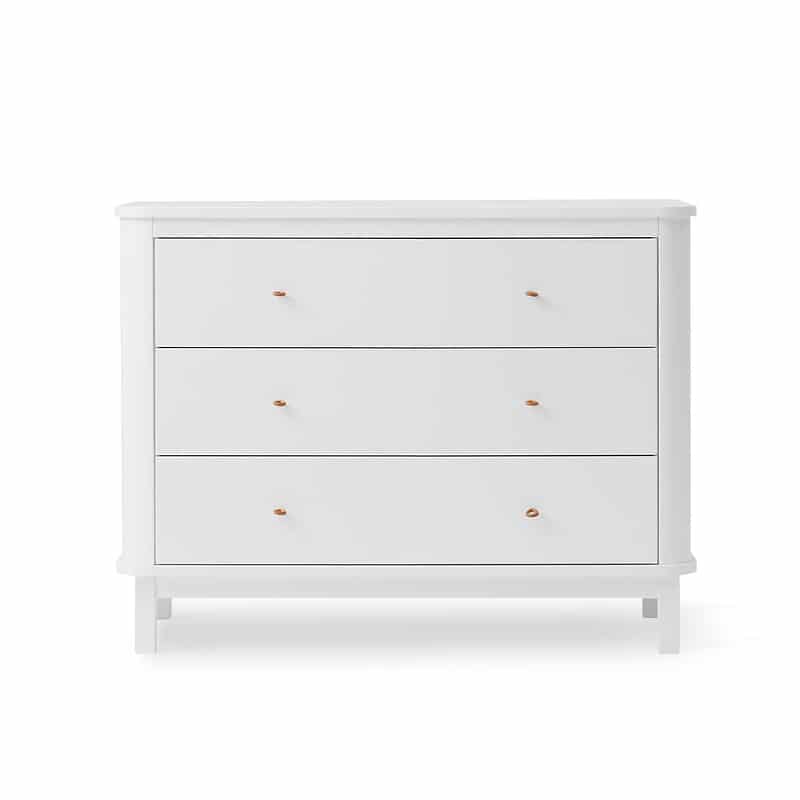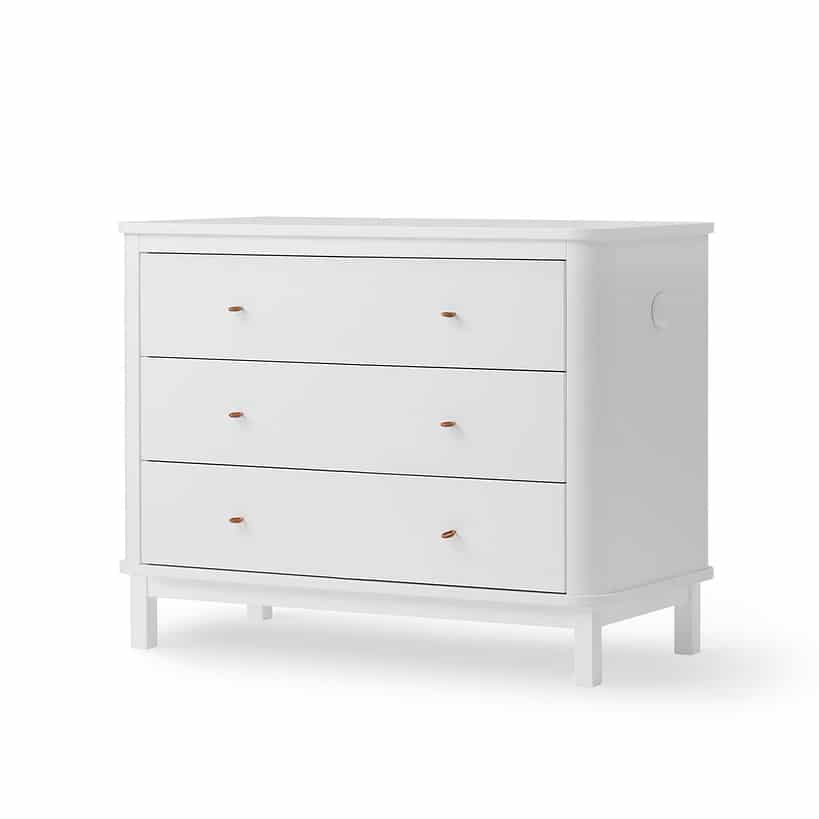 Näkymättömät ruuvit antavat lipastoille puhtaan ja eksklusiivisen muotoilun ja ovat Oliver Furnituren tunnusomainen tavaramerkki. Tyyli on moderni, ja siinä on puhtaat linjat, pyöreät muodot ja hienostuneet yksityiskohdat, kuten täysjyvänahasta valmistetut vetimet ja integroidut, pyöreät koukut. Erityinen pehmeä sulkeutumistoiminto vaimentaa laatikoiden sulkeutumista, joten pienet sormet eivät jää puristuksiin.
