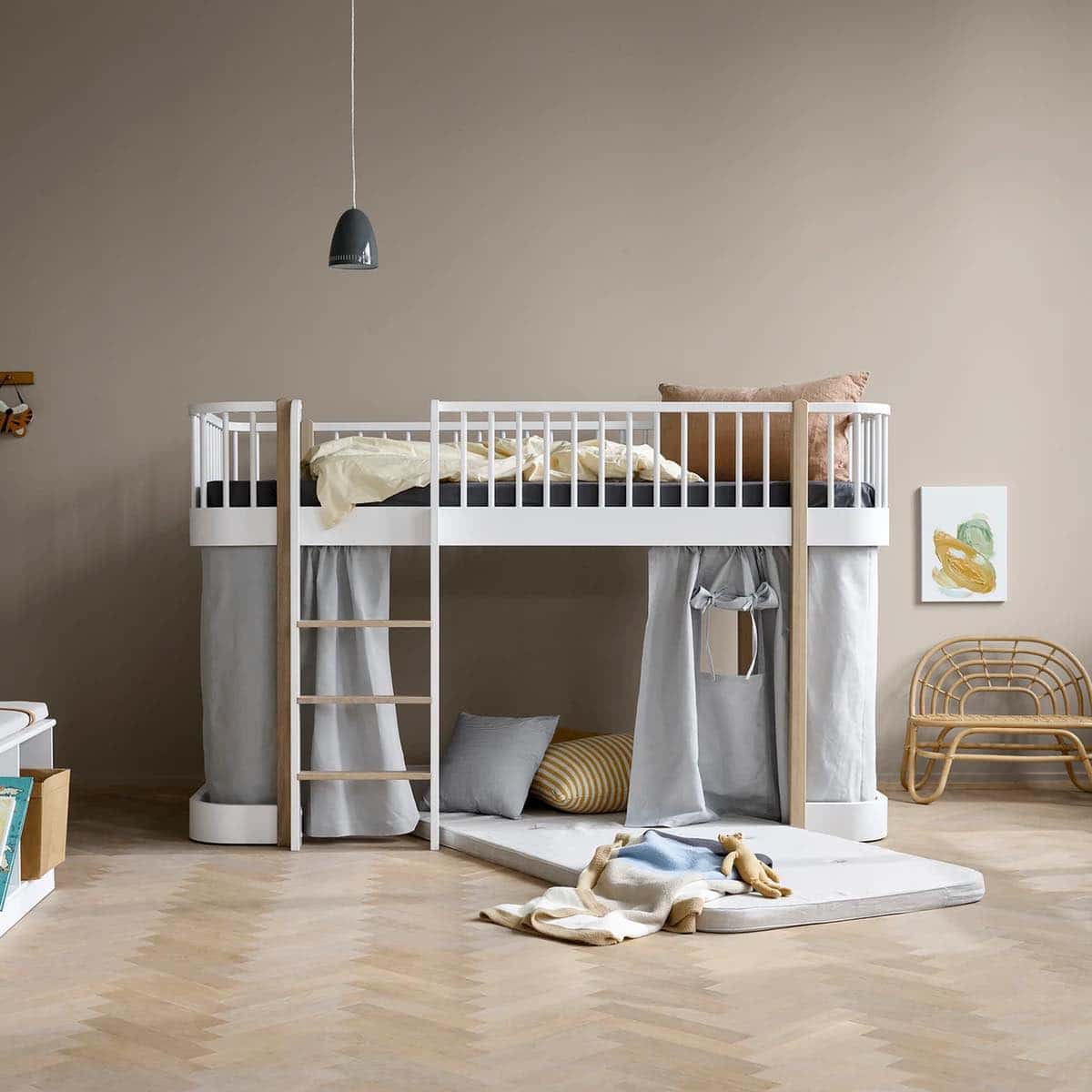 Wood Original -parvisänky täyttää läheisyyden tarpeen ja antaa samalla pienemmälle lapselle mahdollisuuden nauttia matalan parvisängyn eduista. Sängyn alle on tilaa luoda viihtyisä piilopaikka ennen kuin on aika kiivetä tikkaille ja sanoa hyvää yötä, jolloin vanhemmat voivat antaa hyvän yön suukkoja sängyn laidalta.
