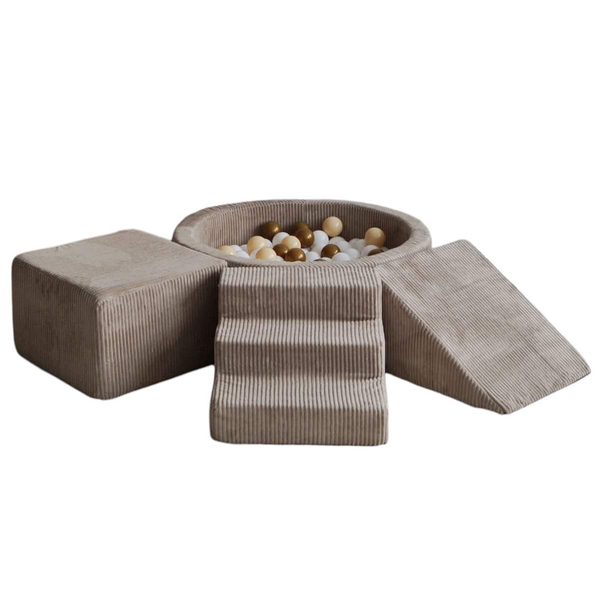 Motoriikkaa ja luovuutta kehittävä superhauska leikkimoduuli tyylikkäällä samettikankaalla. Leikkimoduuli koostuu kolmesta pehmeästä erimuotoisesta osasta, sekä 90x30cm-kokoiselta pallomerestä 200 pallolla.