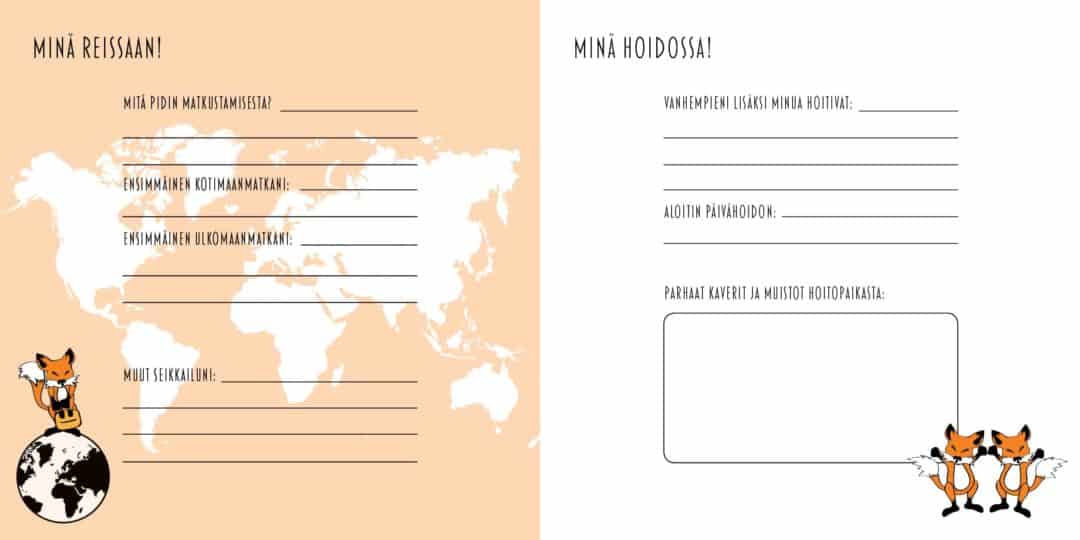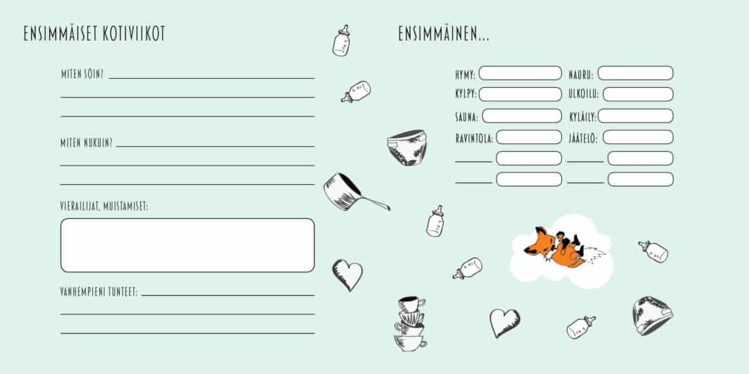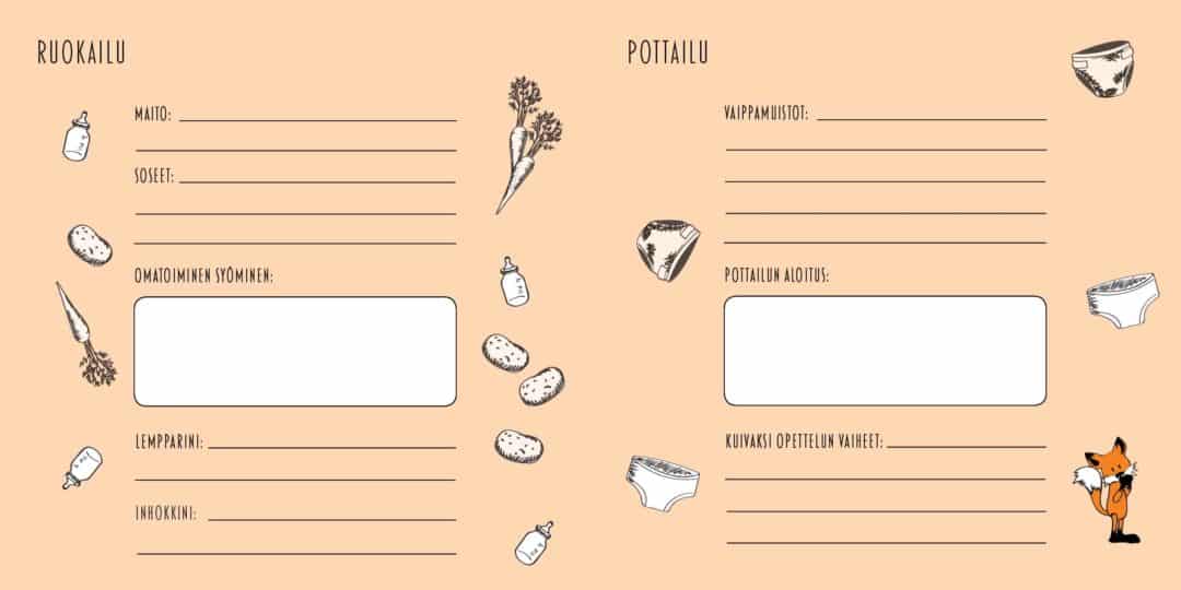 Vanhemmat voivat kirjata vauvakirjaan tunnelmiaan jo odotusajalta, muistella lapsen syntymän jännittäviä hetkiä ja vanhempien päiväkirjasivuille voi tallentaa ihanimmat ja ne pelottavimmatkin hetket/ tuntemukset. Vauvan kasvua, kehitystä ja tärkeimpiä hetkiä täytetään kirjaan kolmeen ikävuoteen saakka. Pastellin värisillä ja mustavalkoisilla sivuilla seikkailee pieni suloinen kettu.