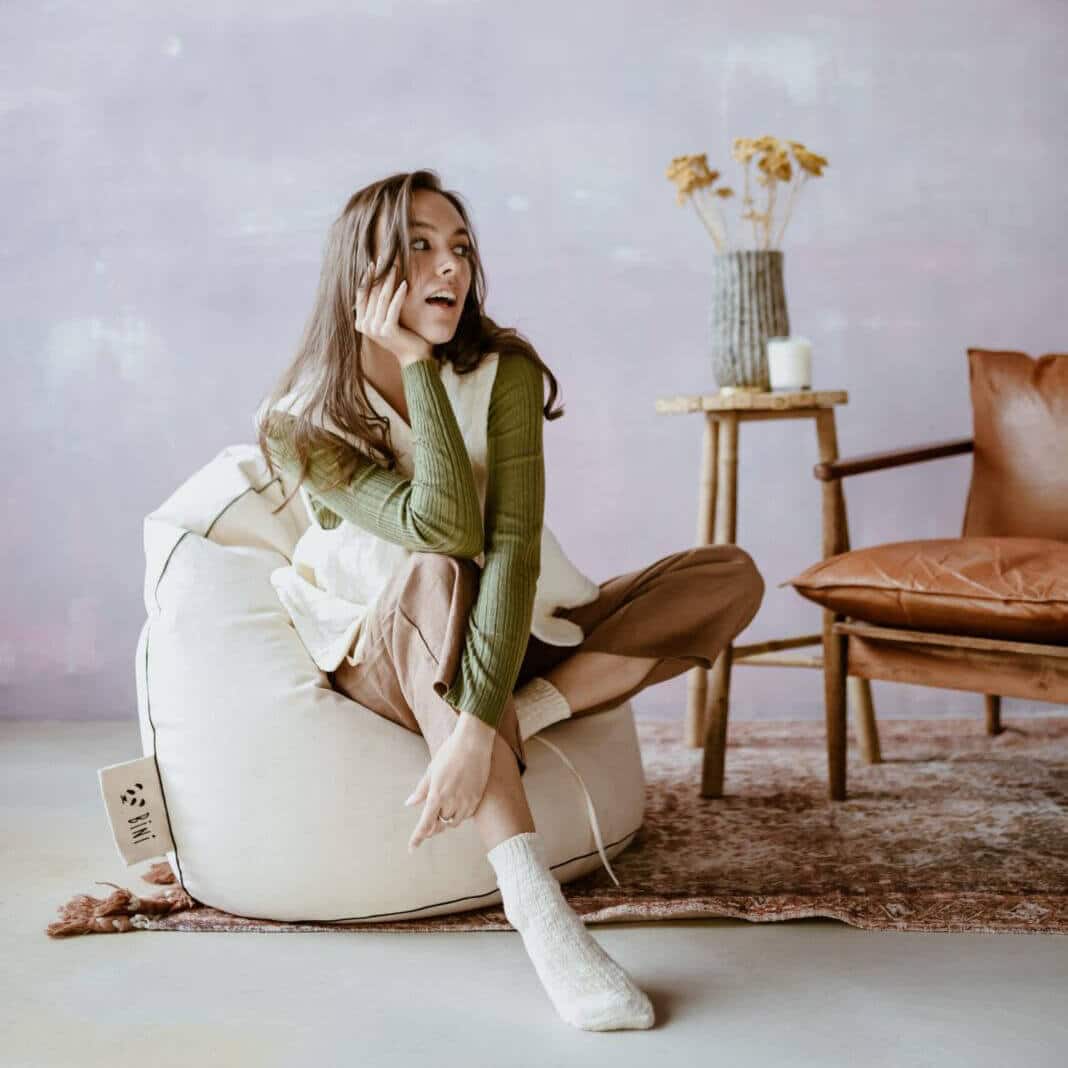 Säkkituoli on valmistettu kestävästä ja iholle mukavan tuntuisesta 100% luomupuuvillasta. Materiaalin valmistuksessa ei ole käytetty mitään kemiallisia prosesseja ja se ei sisällä silikonia. Säkkituolin sisällä oleva extra-sisuspussi sisältää polypropeenitäytettä, mikä muovautuu täydellisesti vartalon asentoon.