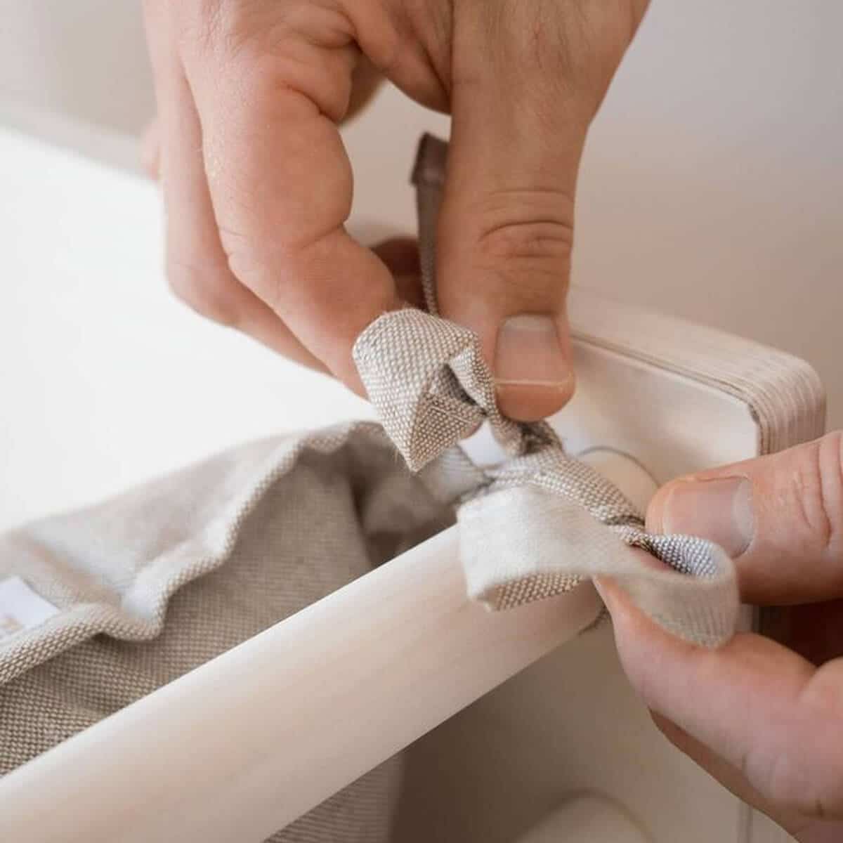 Muhkeassa pehmusteessa on jokaisessa nurkassa ja keskellä on nauhat, joilla pehmusteen voi kiinnittää kaareen, ettei se luisu pois paikoiltaan.