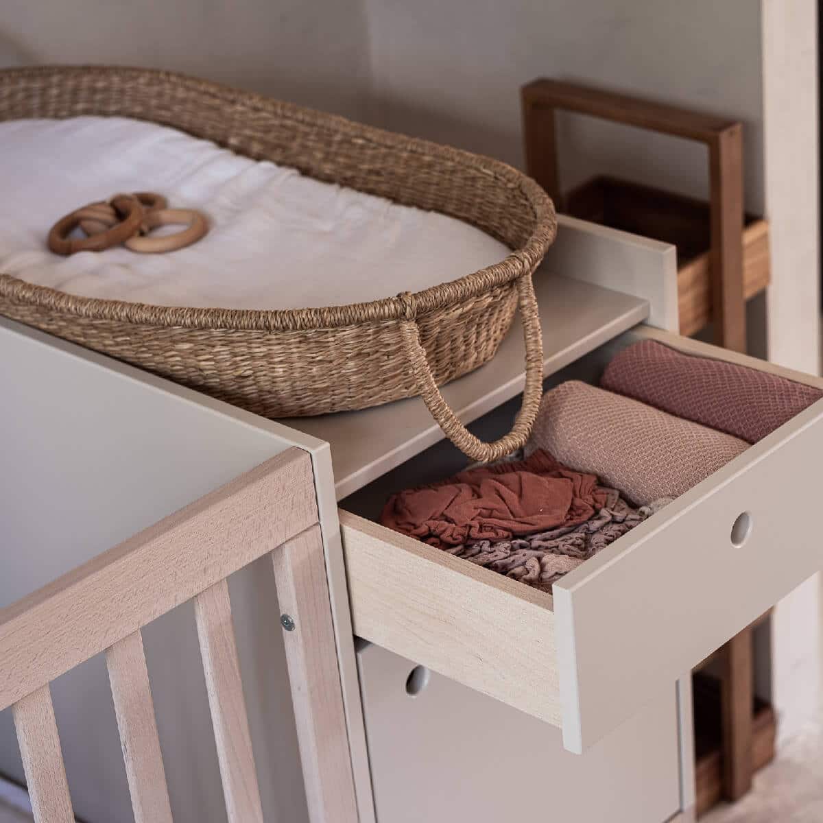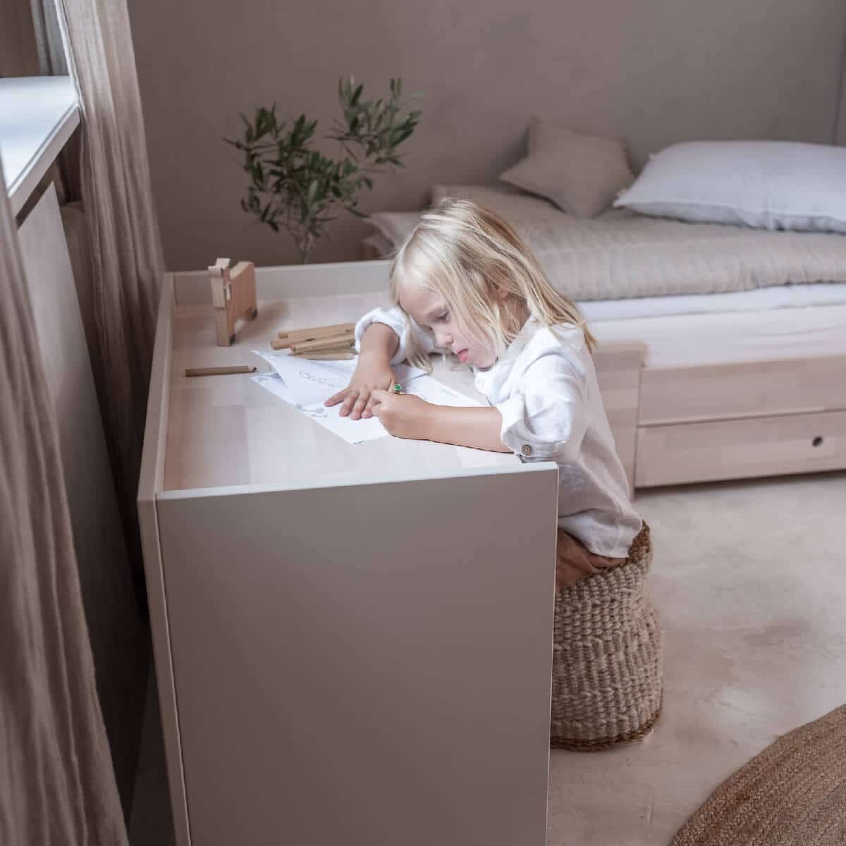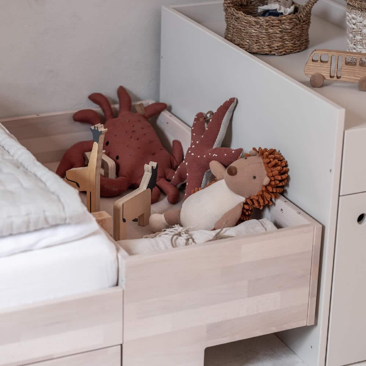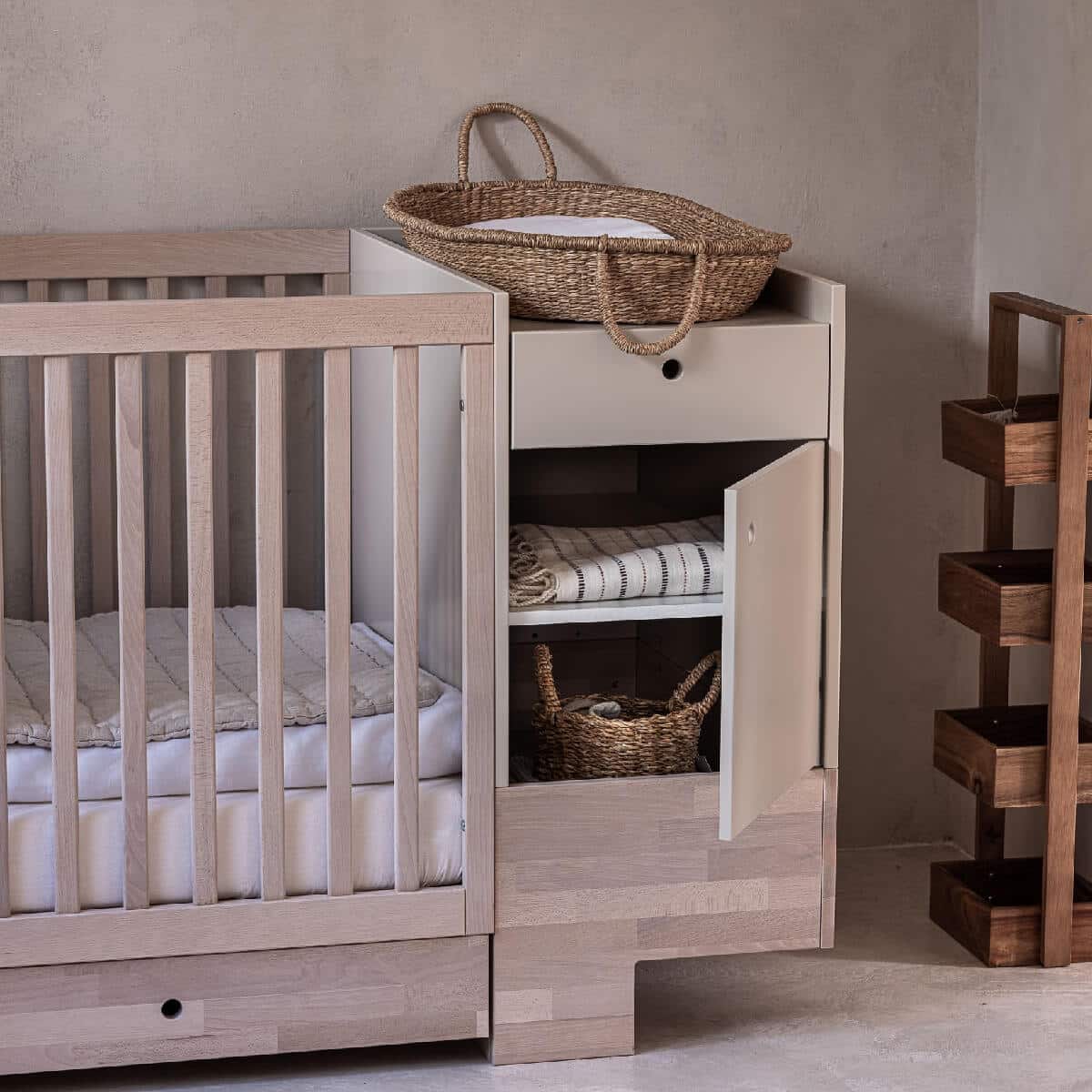 Seikkailu Smart-sängyllä alkaa 80x120cm-kokoisesta sängystä. Käden ulottuvilla oleva kaappi hoitopöydällä, hyllyillä ja laatikolla mahdollistaa vauvan hoidon erittäin mukavasti. 80x120cm sängyssä 3 patjan pohjan säätötasoa: alin asento (etäisyys lattiasta) 21,5 cm; keskiasento: 45 cm; korkein sijainti: 63 cm. Sängyn irrotettavat laidat mahdollistavat, että isommat lapset voivat nousta sängystä itse, mikä varmistaa turvallisen sopeutumisen seuraavaan vaiheeseen eli nukkumiseen ilman kaidetta. Kun lapsi on valmis, voit purkaa seuraavat elementit saadaksesi työpöydän, vapaasti seisovan kaapin, lelusäiliön ja 80x160cm kokoisen sängyn!