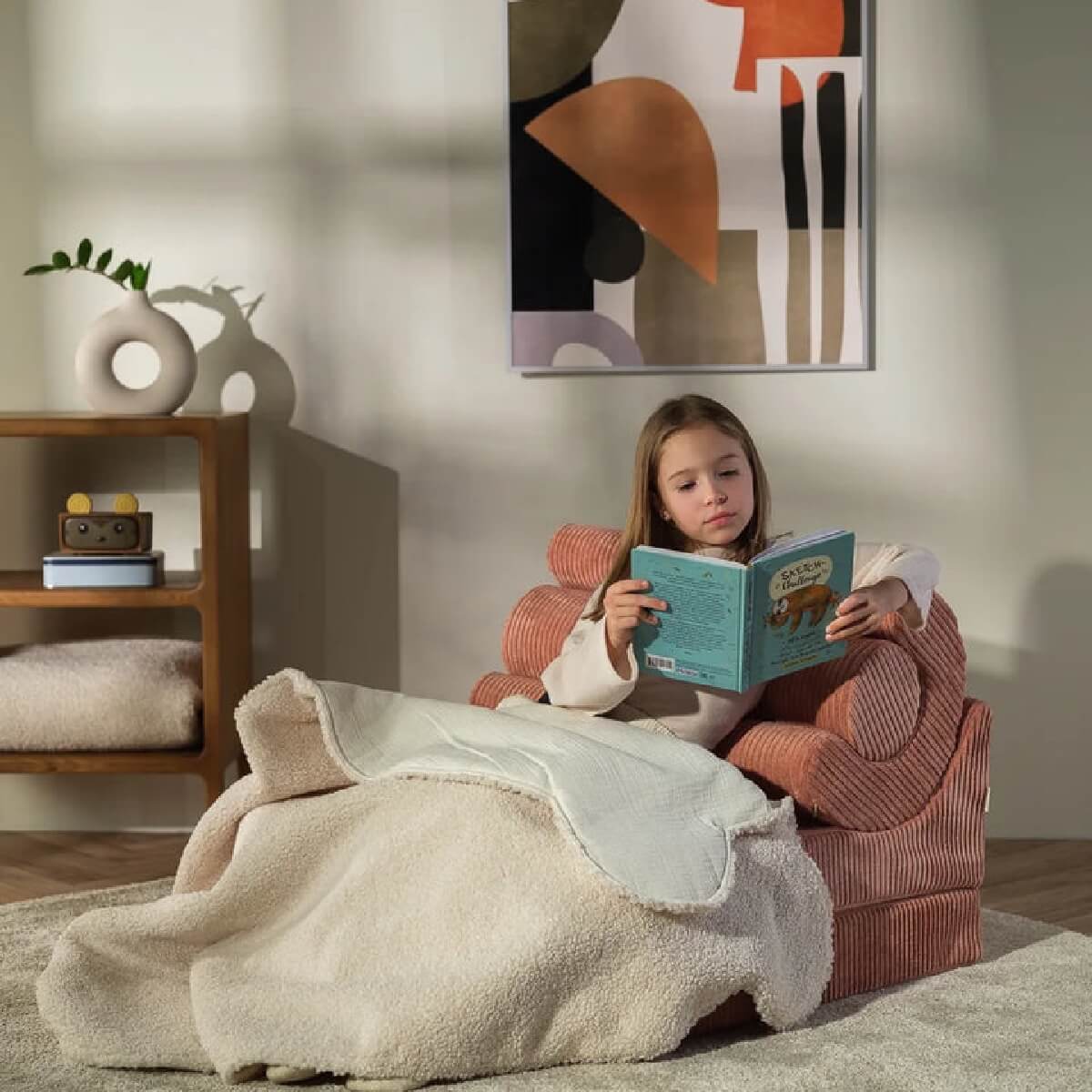 Kätevä taitettava tuoli toimii mukavana lastenhuoneen tuolina/sohvana ja muuntuu patjaksi tai esimerkiksi pehmusteeksi leikkien alle. Tuoli näyttää upealta myös muissa kodin tiloissa kuten olohuoneessa ja tuolin selkänojana toimivat hauskasti muotoillut tyynyt ovat upea ja persoonallinen yksityiskohta sisustukseen. Taittotuoli on valmistettu kauniista vakosametista, mikä on ihanan tuntuinen myös lapsen herkkää ihoa vasten. Yhdistä säkkituolin kanssa saman sarjan muita tuotteita, kuten kauniit vakosamettiset koristetyynyt!