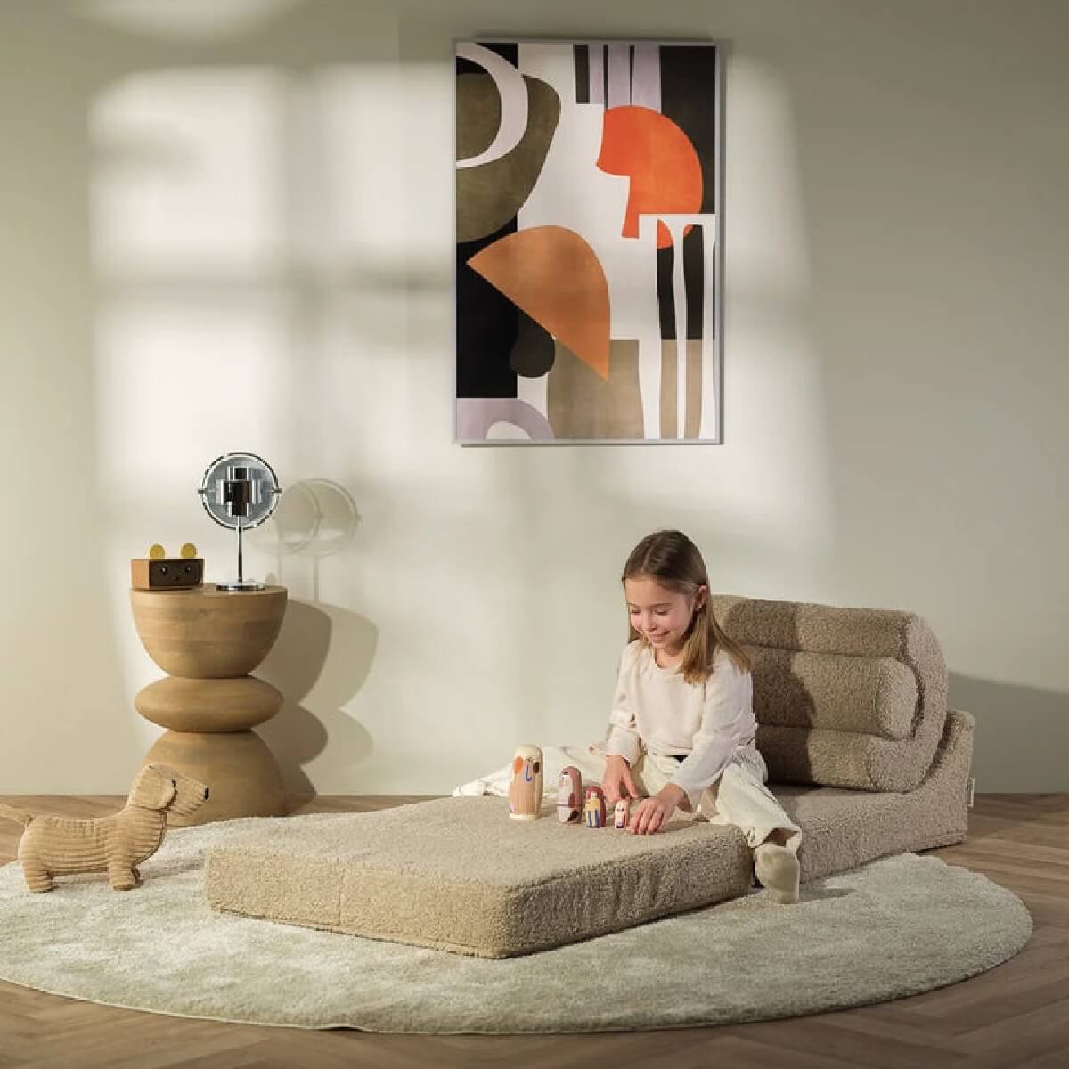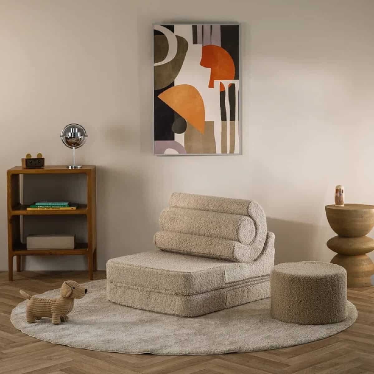 Kätevä taitettava tuoli toimii mukavana lastenhuoneen tuolina/sohvana ja muuntuu patjaksi tai esimerkiksi pehmusteeksi leikkien alle. Tuoli näyttää upealta myös muissa kodin tiloissa kuten olohuoneessa ja tuolin selkänojana toimivat hauskasti muotoillut tyynyt ovat upea ja persoonallinen yksityiskohta sisustukseen. Taittotuolin päällinen on pehmeää teddy-kangasta. Yhdistä säkkituolin kanssa saman sarjan muita tuotteita, kuten kauniit koristetyynyt!