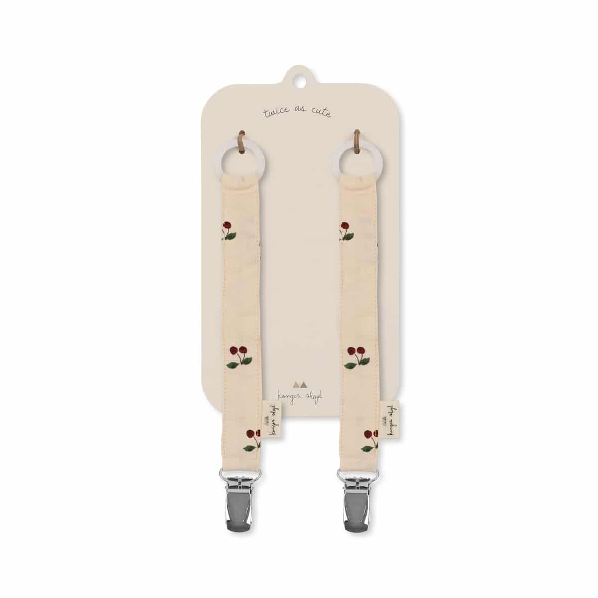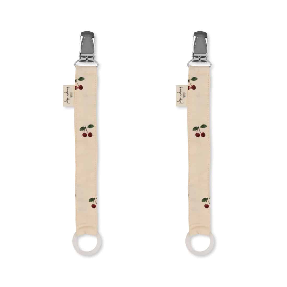 Kaunis puuvillasta valmisettu tuttinauha söpöllä kirsikkaprintillä. Tuttinauha on ihanteellinen apu, jotta minin tutti pysyy tallessa, eikä ei häviä tai putoa lattialle. Paketissa tulee kaksi tuttinauhaa.