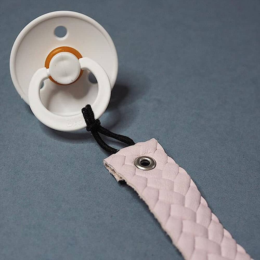 Kaunis nahkainen tuttinauha pitää minin tutin tallessa ja aina käden ulottuvilla. FMAMin tuttinauhoissa on pyöreästä kuminauhasta tehty lenkki, jonka ansiosta se sopii kaikenlaisiin tutteihin. Nauhan toisessa päässä on ”henkseliklipsi”, jolla sen saa kiinni esimerkiksi vaatteeseen.