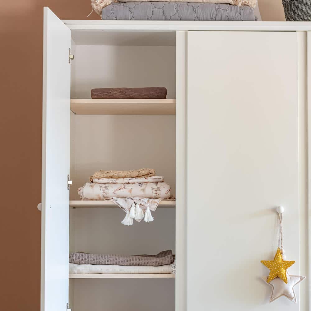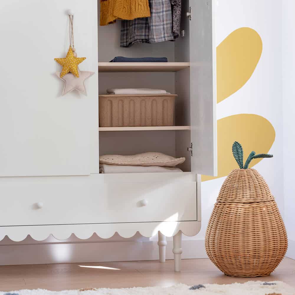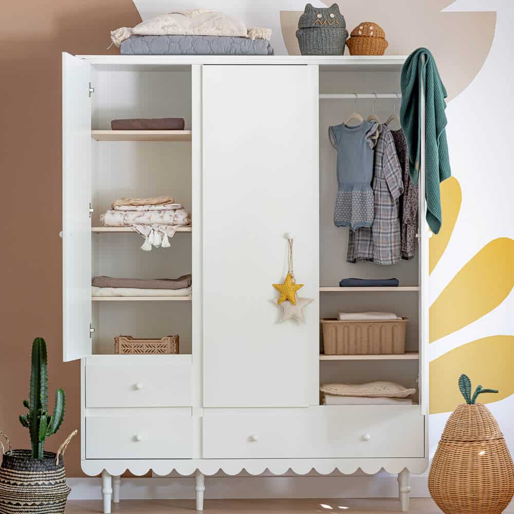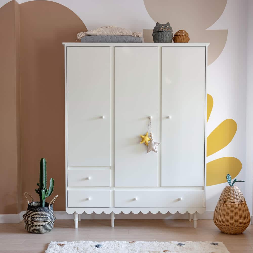 Hurmaavan kaunis vaatekaappi lastenhuoneeseen. Laatikko ja ovet ovat varustettuja itsesulkeutuvilla saranoilla. Yhdistä vaatekaappi muiden Babushka-sarjan huonekalujen kanssa ja luot upean ja persoonallisen lastenhuoneen sisustuksen.
